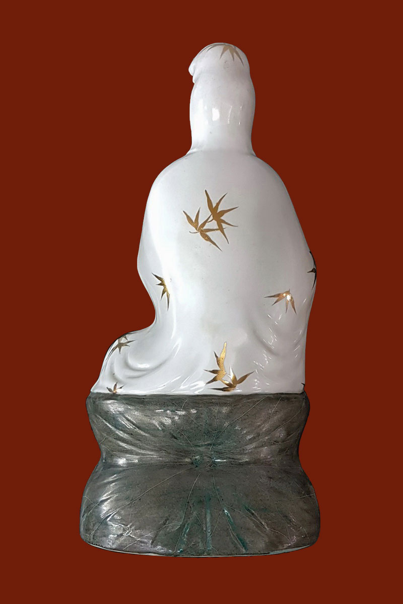 เทวรูปพระโพธิสัตว์ เจ้าแม่กวนอิม เนื้อดินเคลือบเซอรามิก (จีนนอก) ปี พศ.2491 (หลังสงครามโลก ครั้งที่2 สงบแล้ว) ขนาดสูง 12 นิ้ว
