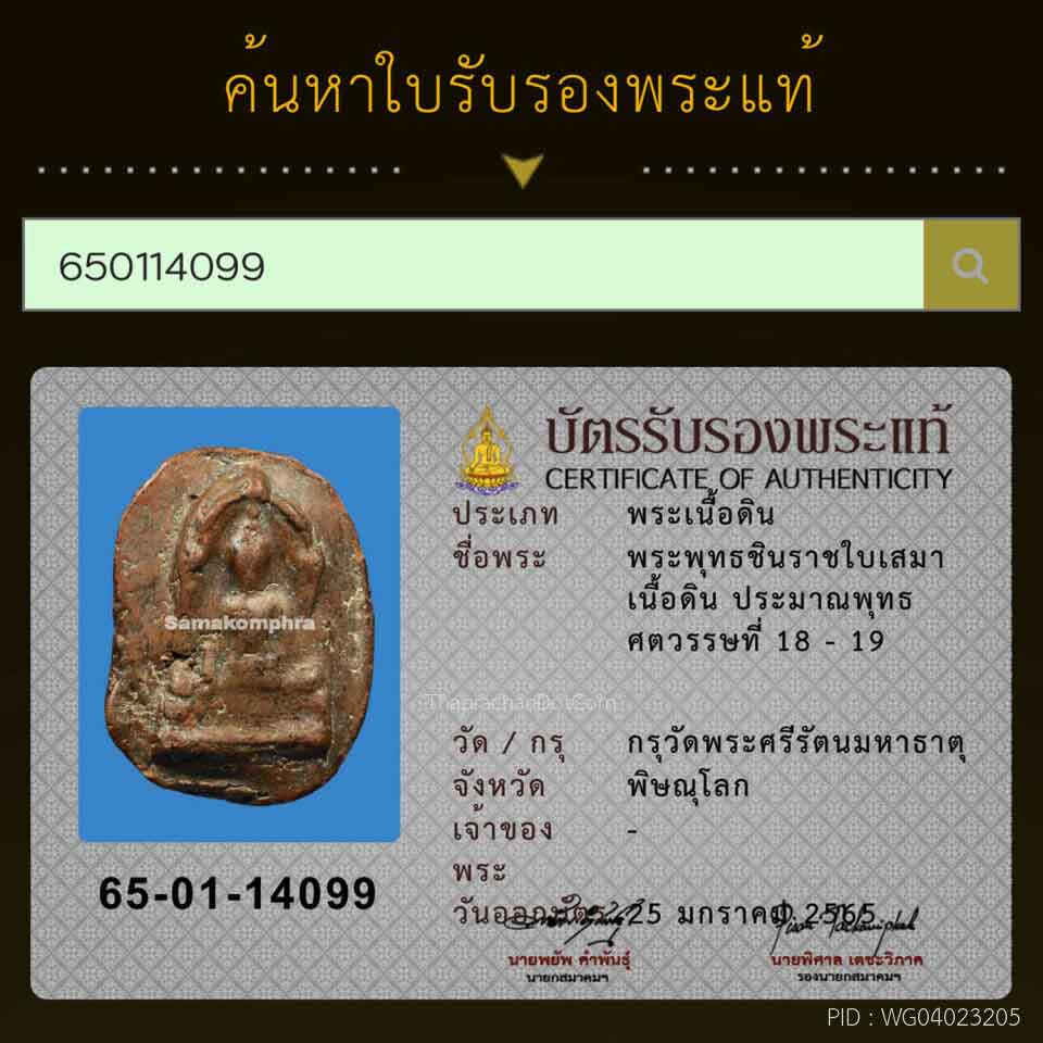 พระพุทธชินราชใบเสมา วัดพระศรีรัตนมหาธาตุ จ.พิษณุโลก (เนื้อดิน) หลังเบี้ยอูมๆสวยสมบูรณ์ ติดรางวัลที่1 งานสมาคม จัดที่ จ.อุตรดิต ที่ผานมา พร้อมทั้งบัตรรับรองสมาคม