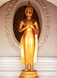 พระหัตถ์ขวาทับพระหัตถ์ซ้าย พระบาททั้งสองประทับยืนชิดติดกัน