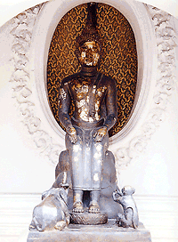 มีช้างหมอบถือน้ำยื่นถวาย และมีลิงหมอบถือรวงผึ้งถวายอยู่ข้างหน้า